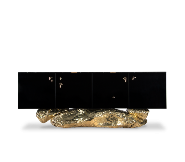 Bold yet elegant black and gold sideboard. The sharped body is fully covered in black high gloss, and it gently lies in an unexpected curved golden base conceived from hammered polished brass, inspired by the cliffs of the historical city of Angra do Heroismo in Azores island, Portugal.
