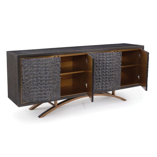 Finished in gold cerused black, this modern sideboard is set on an arching steel base. There are four doors, each with a single piece of faux crocodile hide. The faux crocodile is finished in a variegated black with distressed gold cerusing. The front inset and metal base are in dark Aztec gold.