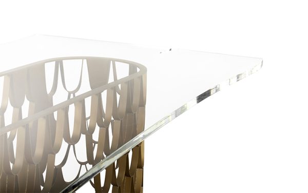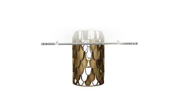 Koi carp is a recurring symbol of Japanese culture. Its natural colour mutations reveal their capacity to adapt, just like KOI II Dining Table. Featuring a base in aged brass and a top in acrylic, this brass rectangular dining table will add refined elegance to any dining room design.