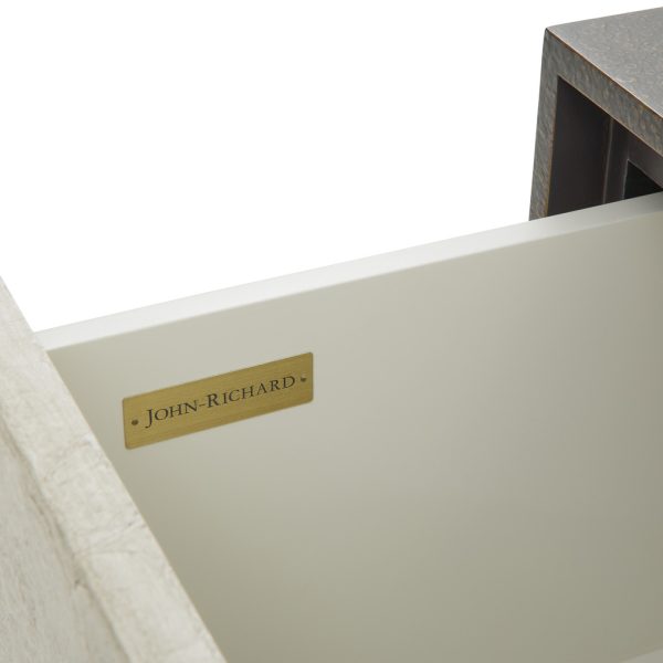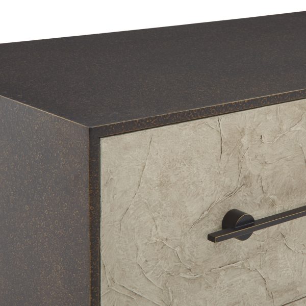 The Nouvelle Drawer is a stunning blend of refined tones and rich textures that greatly elevates an interior space. A wooden frame sitting atop two slender legs is adorned in a bronzed finish, playfully contrasted by ivory-hued rice paper stretched across the facade. The two drawers feature long steel handles, matching the frame to complete the look.