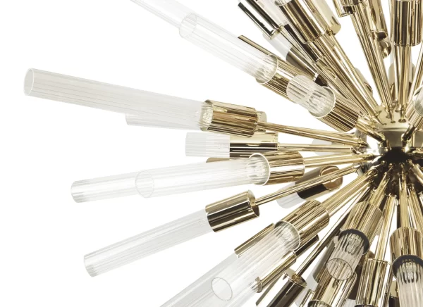 Preserving the inspiration of the natural sensation of waterfalls, this unique piece was born to complete the superb Waterfall Collection. Made with high-quality brass and beautifully handmade ribbed tubes of crystal glass, this powerful creation will fit perfectly into any ambiance.